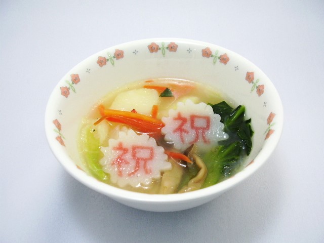 学校給食用に開発した商品です。すり身は無リンのすり身を使用しています。3mm幅でスライスしており、1パック(160g)あたり約65枚入っています。なるとの「の」字を「祝」にしました。