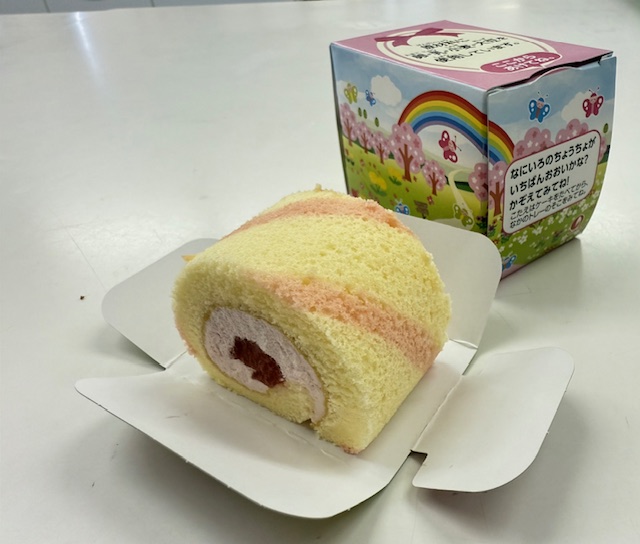 春のお花をイメージした黄色とピンクの色合いが特徴のロールケーキです。いちごは国産にこだわりました。【小箱・グラシン紙・スプーン:紙】
