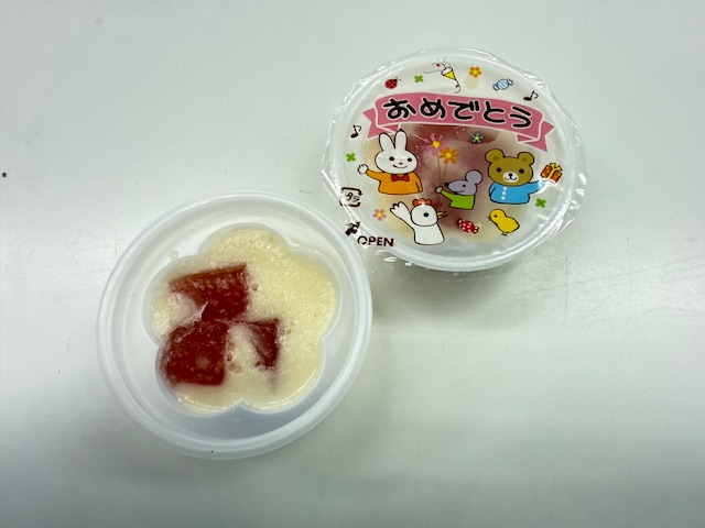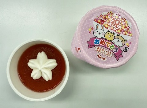 いちごのピューレと果汁を使用したゼリーにホワイトクリームをトッピングした紅白デザート。桜をイメージしたクリームには、「子ども達の未来に桜が咲きますように」という願いを込めました。
