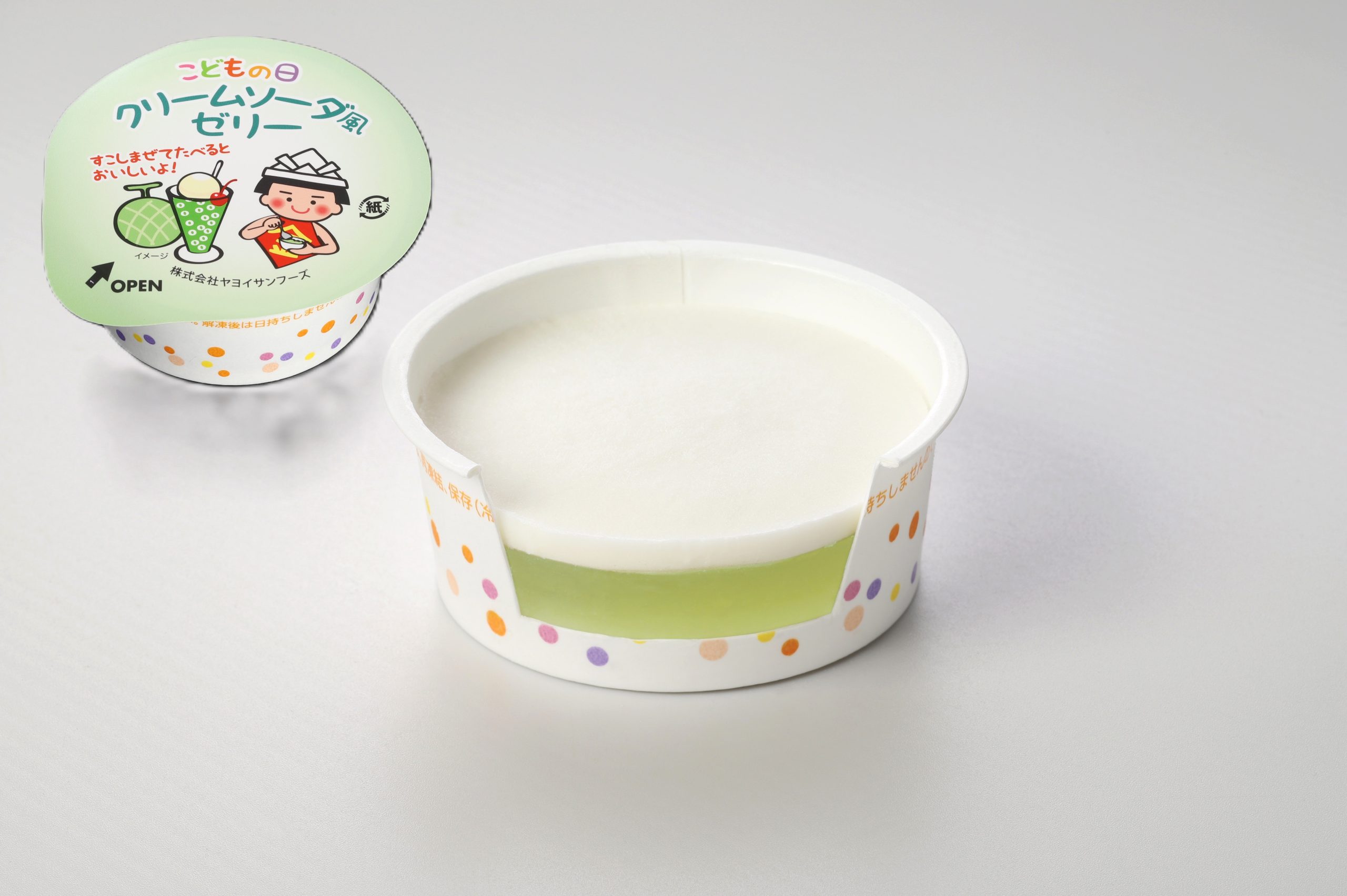 サイダー風ゼリー、レモン風味の豆乳ゼリー、りんごゼリーを重ね、爽やかに仕上げたゼリーです。こどもの日をイメージしたかわいらしい蓋のデザインは5種類あります。 【フタ・カップ・スプーン:紙】