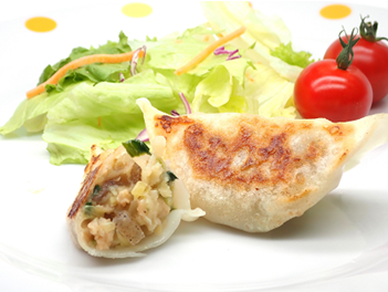 【焼】熱したフライパンに油をひき、餃子をはなして並べます。水を約150cc上からかけ、フタをして強火で蒸し焼きにします。水気がなくなったら弱火にし少量の油を加え、きつね色の焼き目が付いたら出来上がりです。